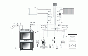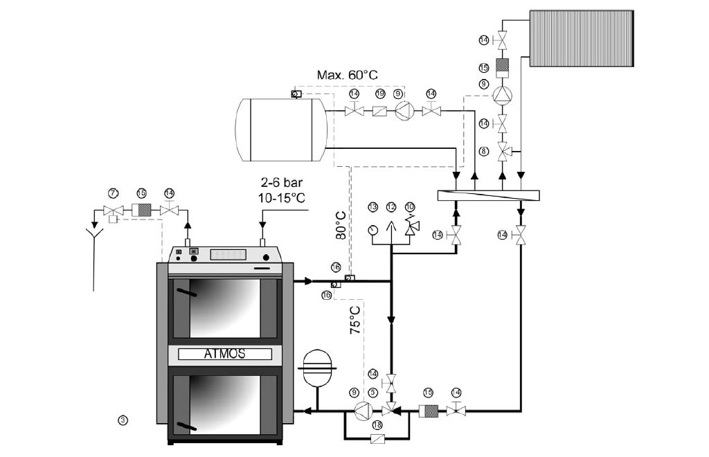 Kotle o vyšším výkonu s termoregulačním ventilem a silným čerpadlem, nebo trojcestným ventilem ovládaným servopohonem s elektrickou regulací udržující minimální teplotu vratné vody 65 - 75 °C. Při zapojení kotle s akumulačními nádržemi můžeme použít otevřenou nebo uzavřenou expanzní nádobu.